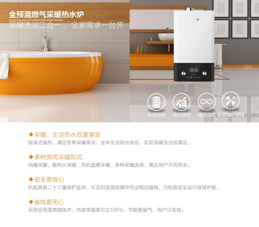 全預(yù)混燃燒結(jié)合雙寬域功率調(diào)節(jié),節(jié)能恒溫,溫差在±0.5℃之間,保證熱水四季恒溫快速出熱水,減少水流浪費(fèi),生活水溫度35-60℃,采暖水溫30-80℃