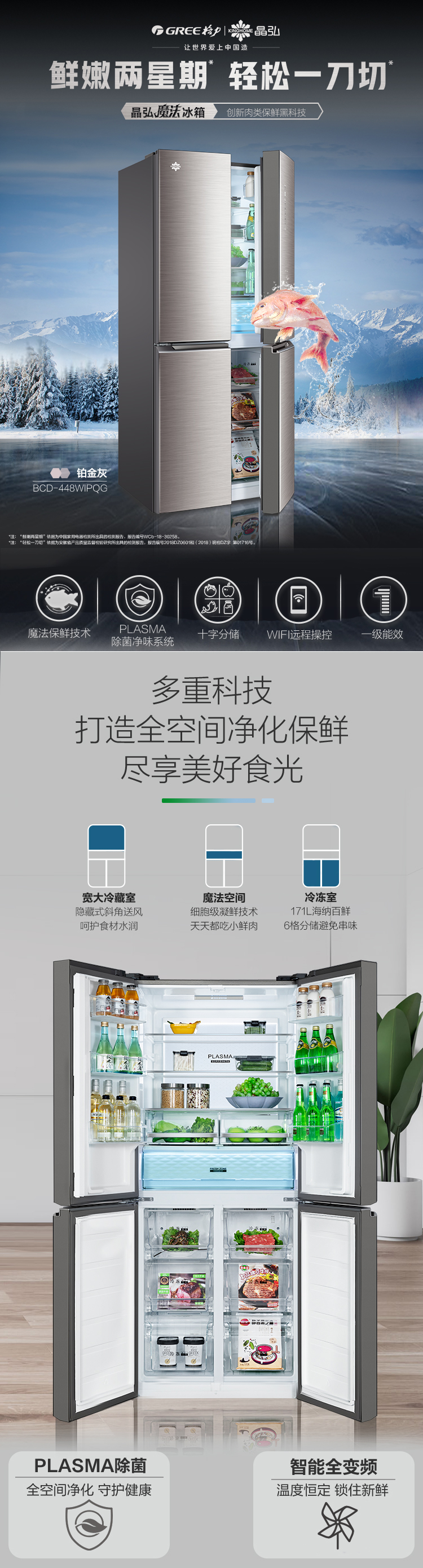 搭載-5℃嫩凍凝鮮科技,鮮嫩兩星期,輕松一刀切。Plasma等離子除菌凈味,除菌保鮮,長久新鮮。4檔保鮮模式,多重角色時刻新鮮。