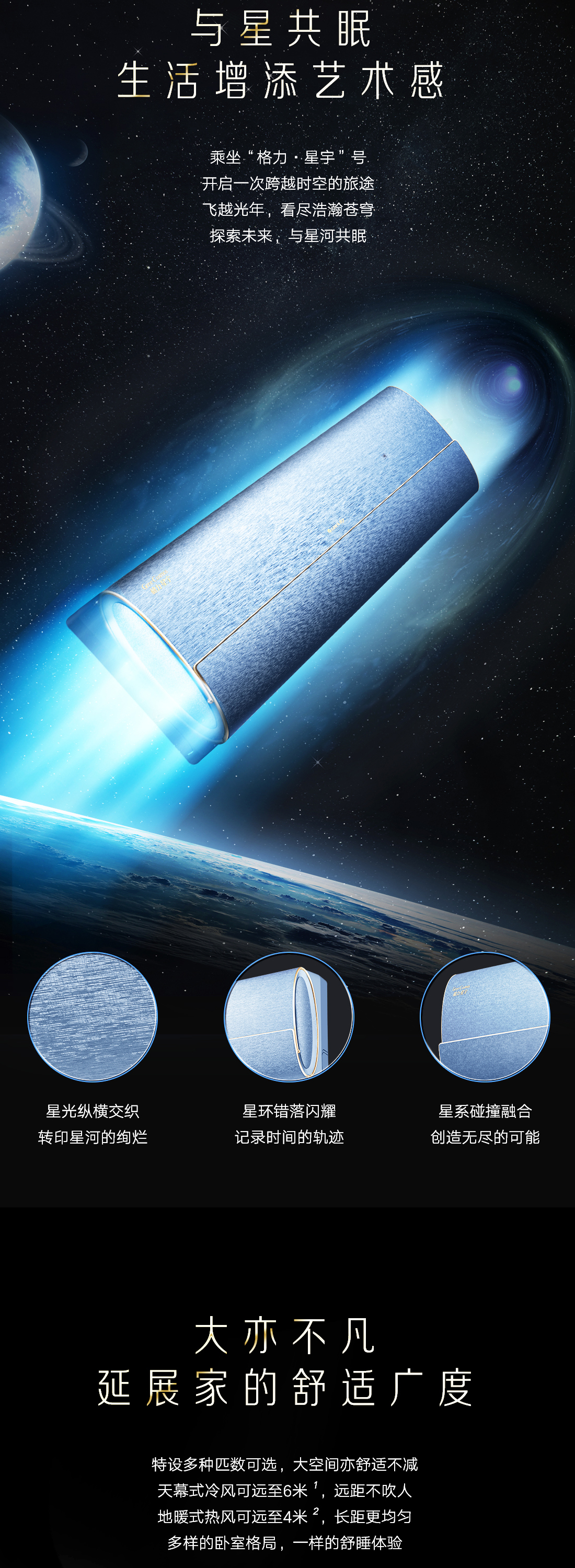 歡迎來到睡眠星球!格力睡眠空調(diào)“星”升級,格力·星宇空調(diào)關(guān)注視、聽、嗅、觸、心每一個(gè)睡眠感官,構(gòu)建身心共憩的全感和諧之境。